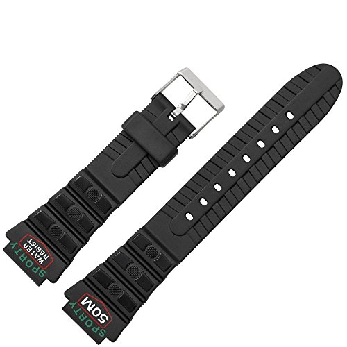- DESIGN - sportliches Ersatzband aus Kunststoff fr Uhren in der Farbe Schwarz | sportlich bedruckte Bandoberflche mit Schriftzgen "50M", "SPORTY" & "WATER RESIST" | Uhrenband mit klassisch silberner Dornschliee aus Edelstahl | markantes Kunststoffband mit dynamischer Optik | passt besonders gut zu Taucher-Uhren sowie Uhrmodellen aus Sport- & Outdoor-Kollektionen | geringe Farbabweichungen knnen aufgrund der Eigenschaften des Uhrbandes oder wegen der Darstellung am Monitor auftreten